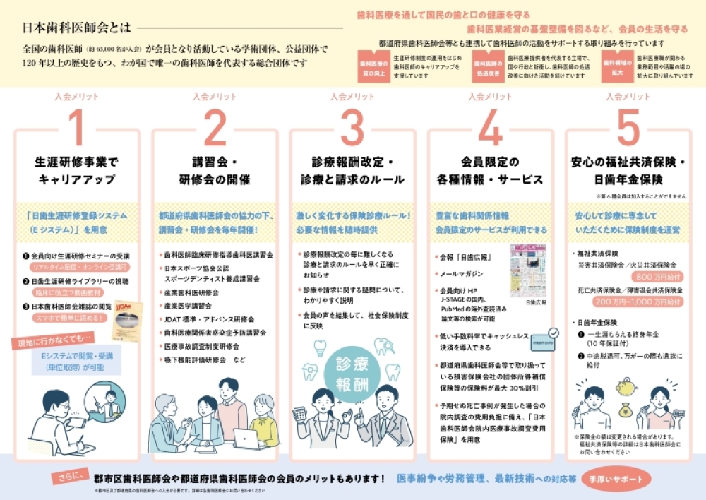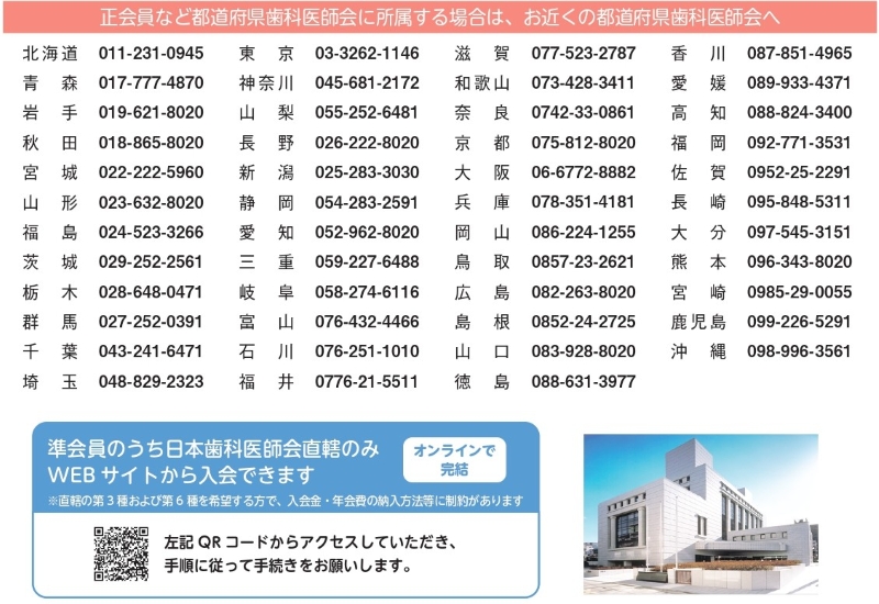 この正会員、準会員の入会のご案内は、歯科界の明るい将来展望を切り開くために、組織基盤の確立・強化が急務であるとの見地から、日本歯科医師会の協力要請に応えるものです。